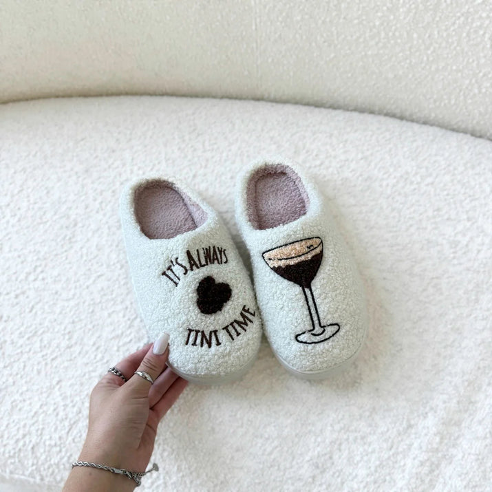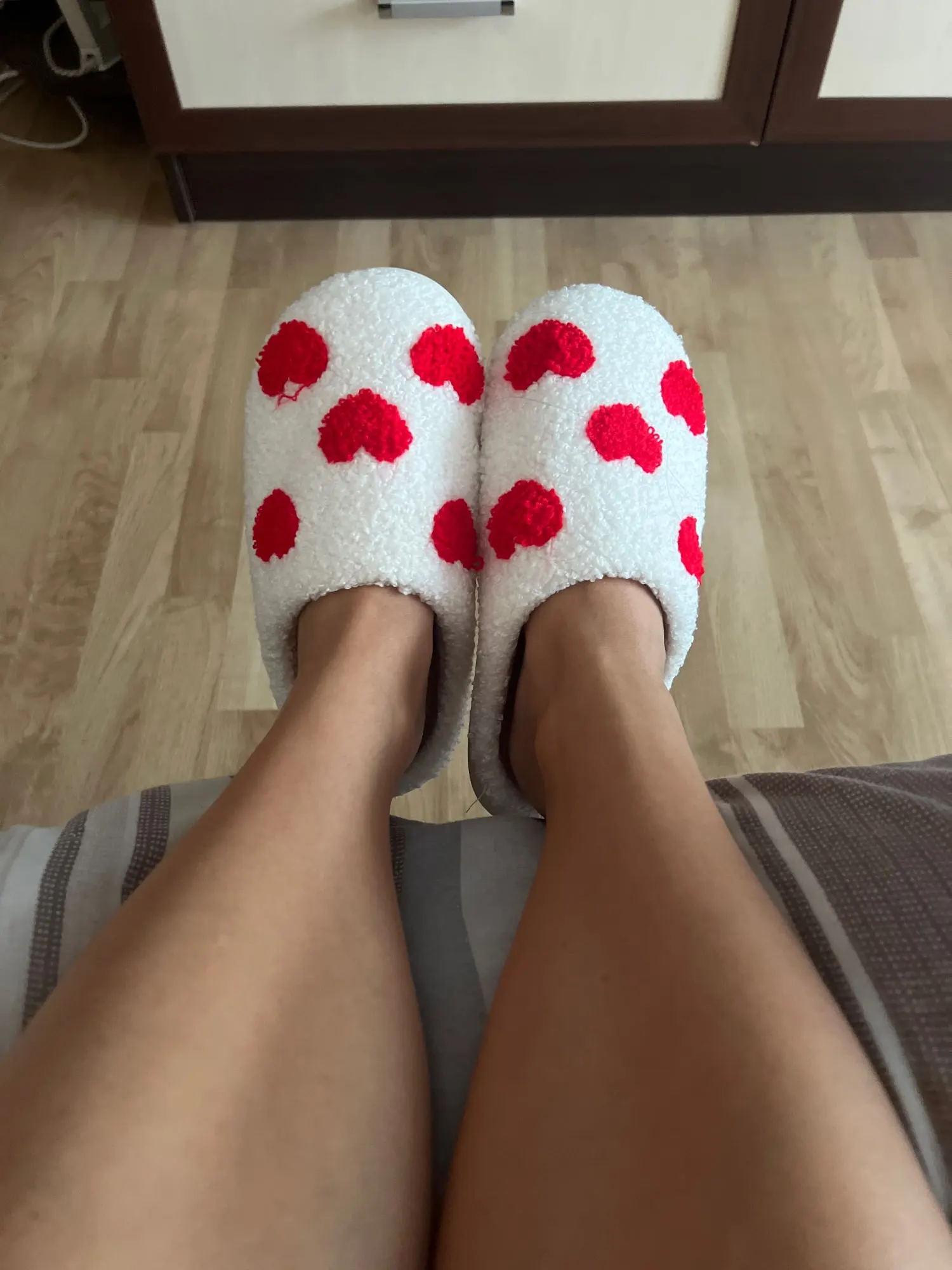Pantofole da donna invernali, soffici e comode, con cuori e funghi decorativi.